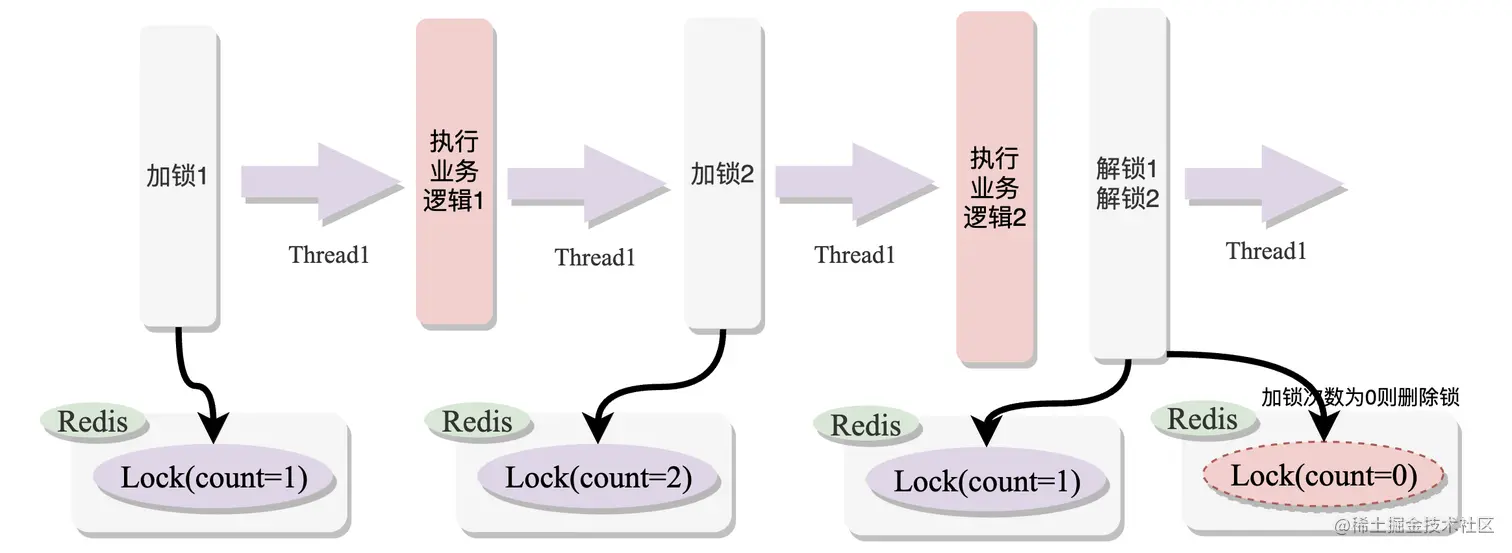 实现可重入机制的原理就是在加锁的时候记录加锁次数,在释放锁的时候减少加锁次数,这个加锁的次数记录可以存在Redis中,如下图所示: