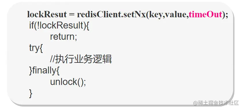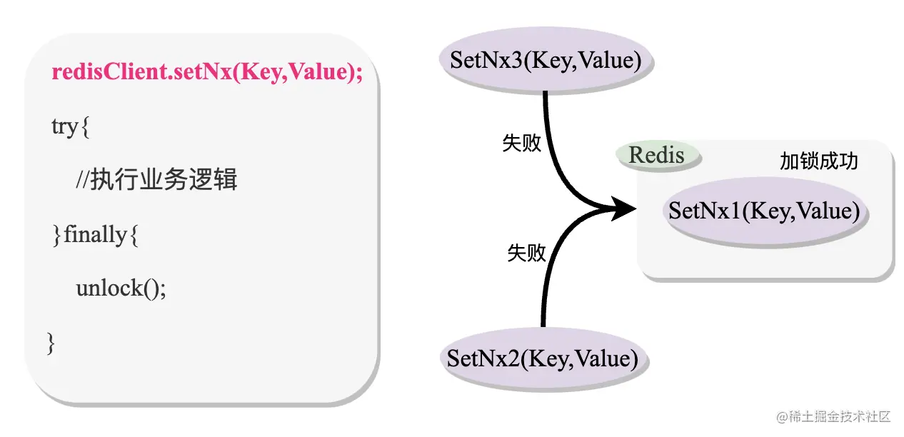 利用如上的setNx命令便可以简单的实现加锁功能,当多个线程去执行这个加锁命令时,只有一个线程执行成功,然后执行业务逻辑,其他线程加锁失败返回或者重试