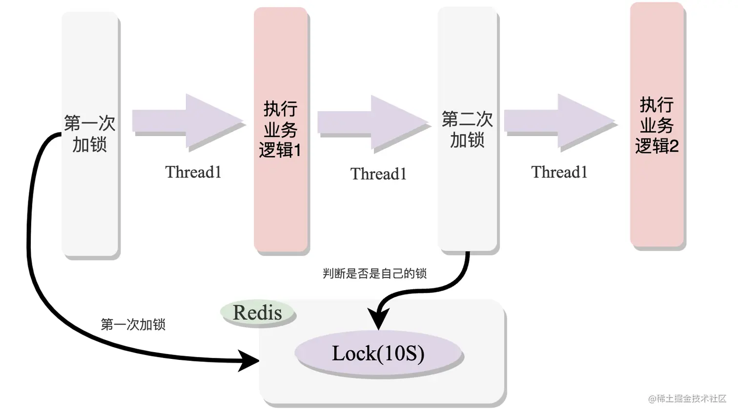 对于一个功能完整的锁来说,可重入功能是必不可少的特性,所谓的锁可重入就是同一个线程,第一次加锁成功后,在第二次加锁时,无需进行排队等待,只需要判断是否是自己的锁就行了,可以直接再次获取锁来执行业务逻辑,如下图所示: