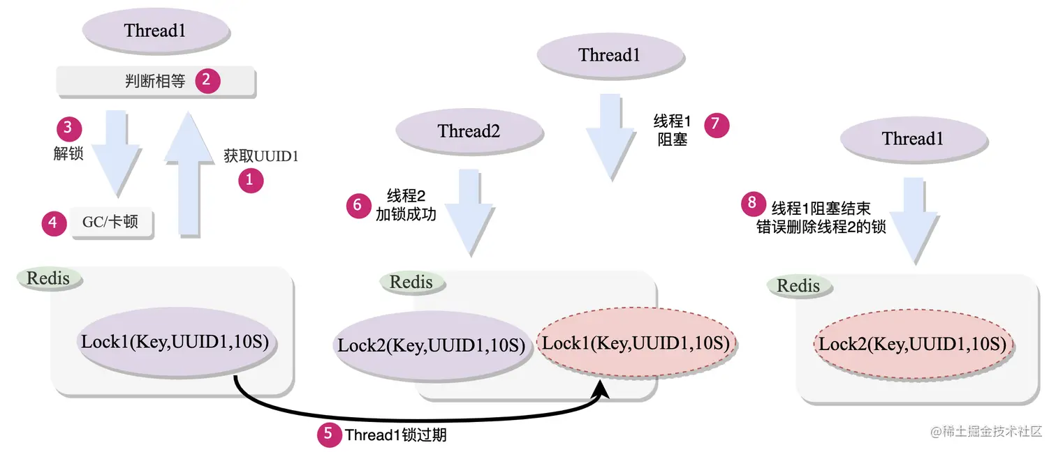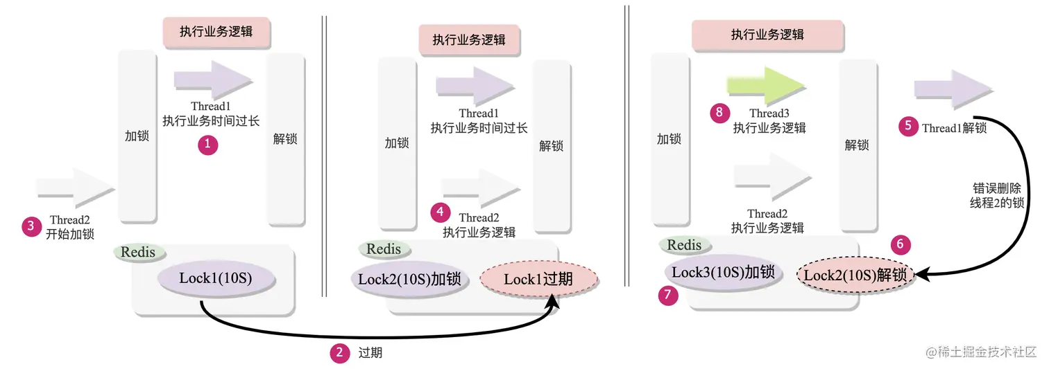 (4) 线程1卡顿结束继续执行解锁指令,就会错误删除线程2的锁