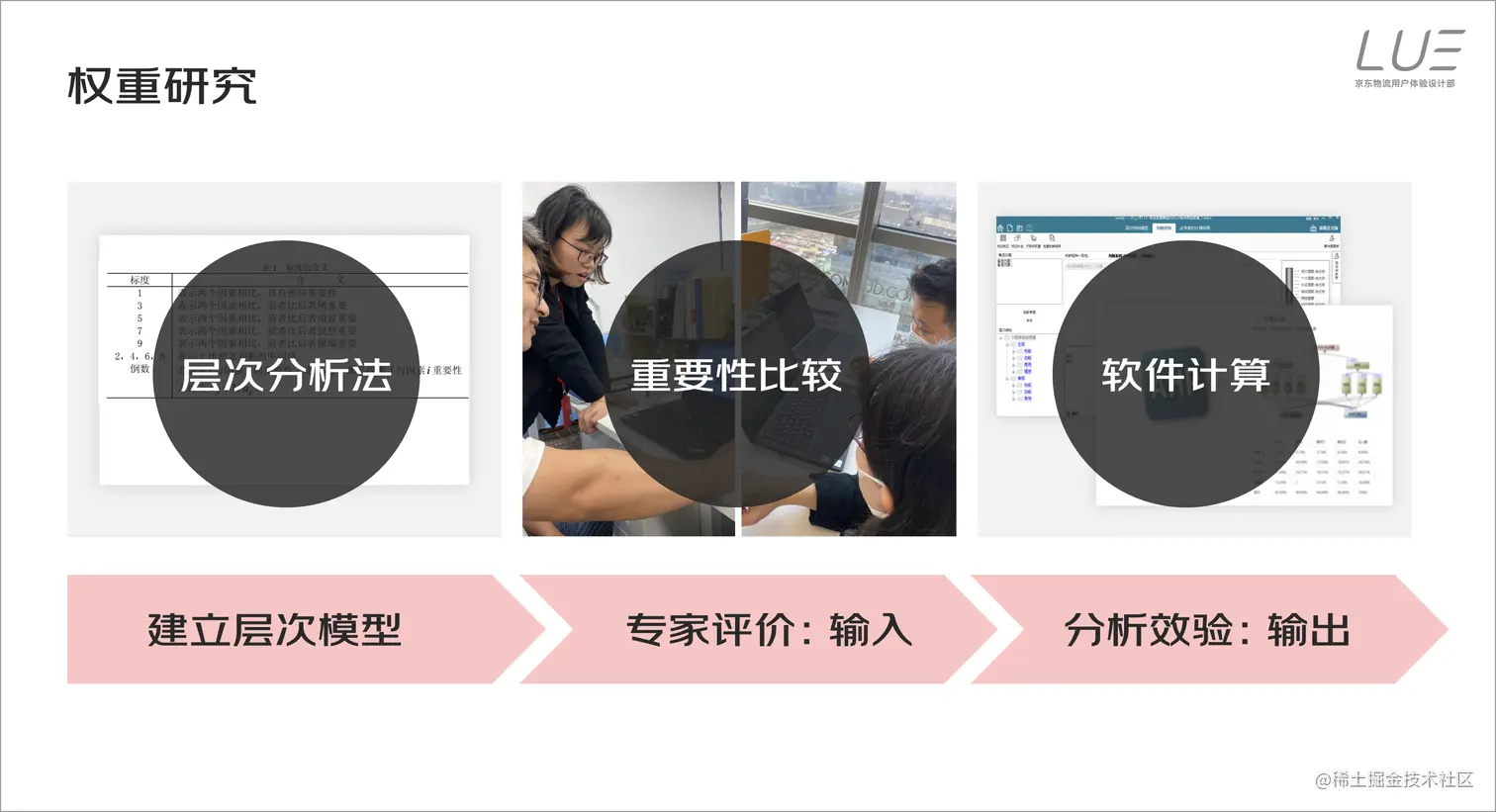 通过这样的方法,我们同时确定了主客观权重,以及客观各维度的权重系数。这次主客观权重相较于之前是有变化的,而这种变化的根本原因在于,自上而下对现有产品清晰定位及最终目标导向的结果,可以说是团队共识之后,致力做好用户体验决心的一种体现。另外,客观各维度的权重也会随着产品的发展阶段而进行调整。