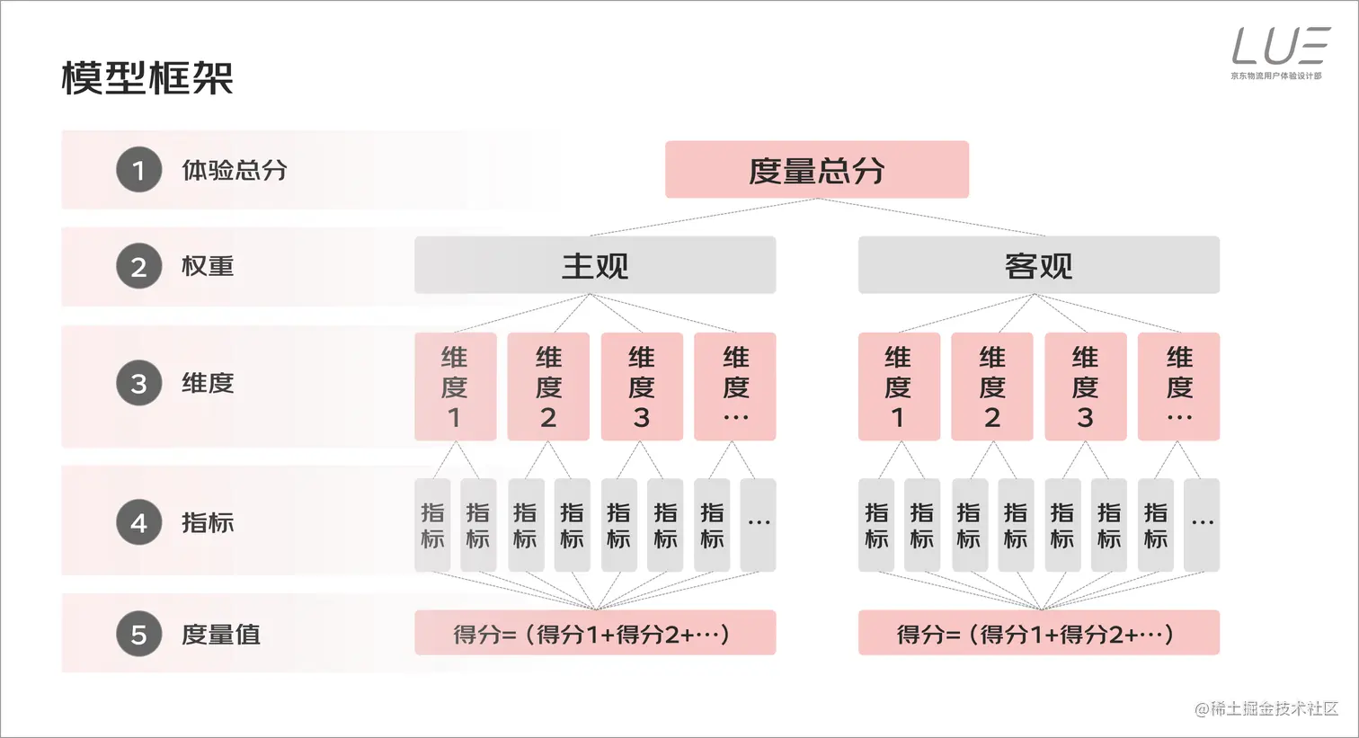度量模型共五层,第一层为度量分数——体验总分;第二层为权重层,包含主观、客观权重;第三层为主客观对应的维度层;第四层则是对应维度下指标层;第五层则是具体指标赋分情况。