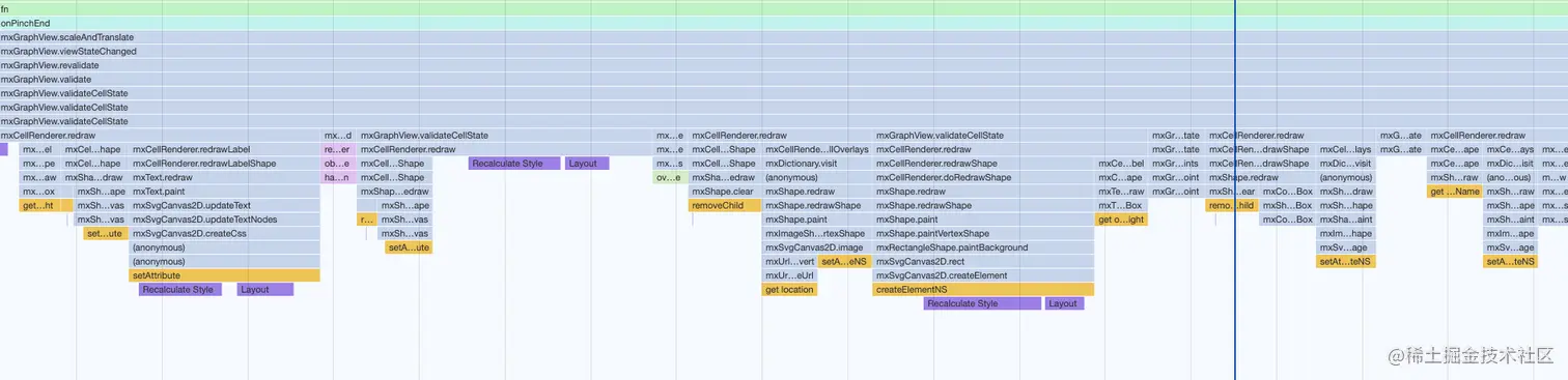 不过性能中依然有一定频率的掉帧。原因就是缩放结束的时候,同步给mxGraph进行绘制的时候,mxGraph遍历了每个结点进行位置计算和重新绘制