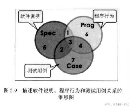 在图 2-9 中,分别又 3 个圆代表软件说明的所有内容、程序的所有行为和所有的测试用例。由于 3 个圆的相互部分重叠,导致维恩图中出现了 7 个部分,分被标示在图中。这 7 个部分分别代码如下的含义。