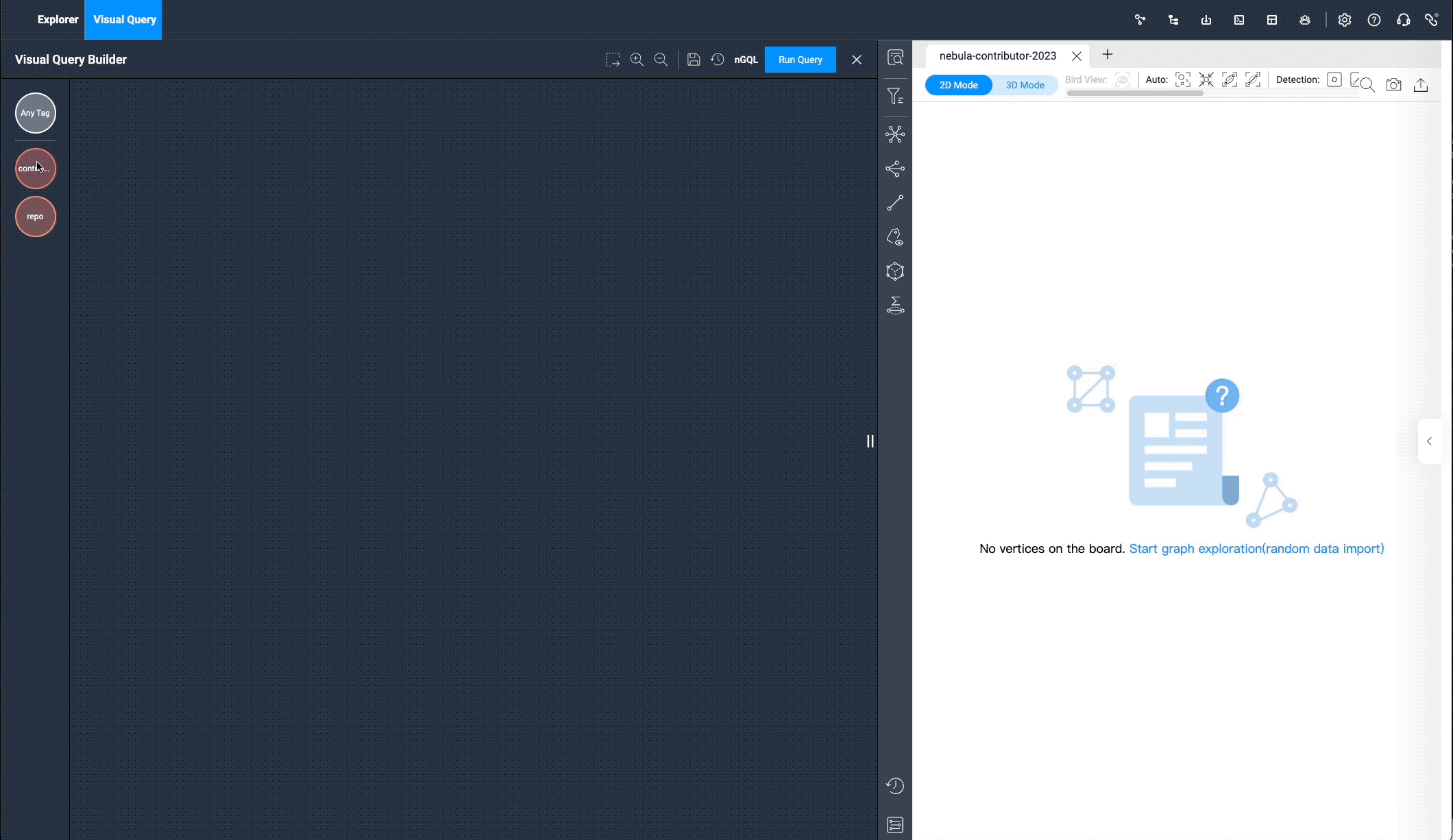 现在问题来了,作为一个不会写 SQL 的运营,如何满足我司研发提出的让他感动一下的 contributor 系统表?冷静下,ClickHouse 的这个 SQL 看 contributor 的方式固然很酷,但是终归到底是要查看贡献者同开源项目的关系。说到“搞关系”,还不得是我们的图数据库。巧的是,NebulaGraph 就是一款图数据库,虽然在本文的数据集过于简单用,也不是什么大规模数据,用图数据库有点“杀鸡用牛刀”,但不妨一试。看看,不会写 SQL 的运营怎么用可视化的方式来查看 contributor 和项目关系。
