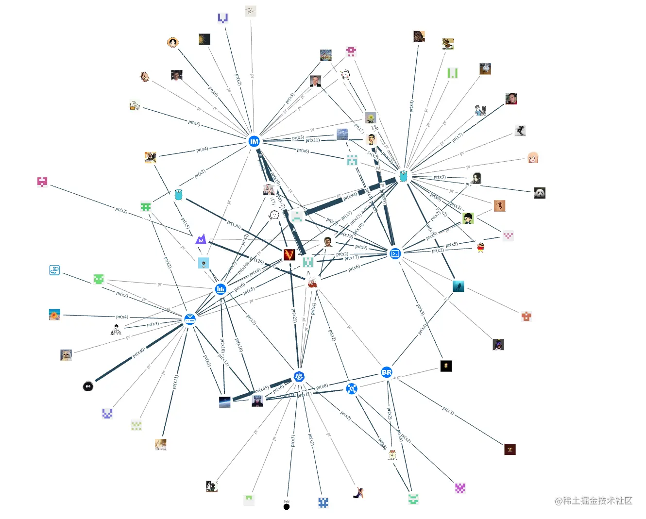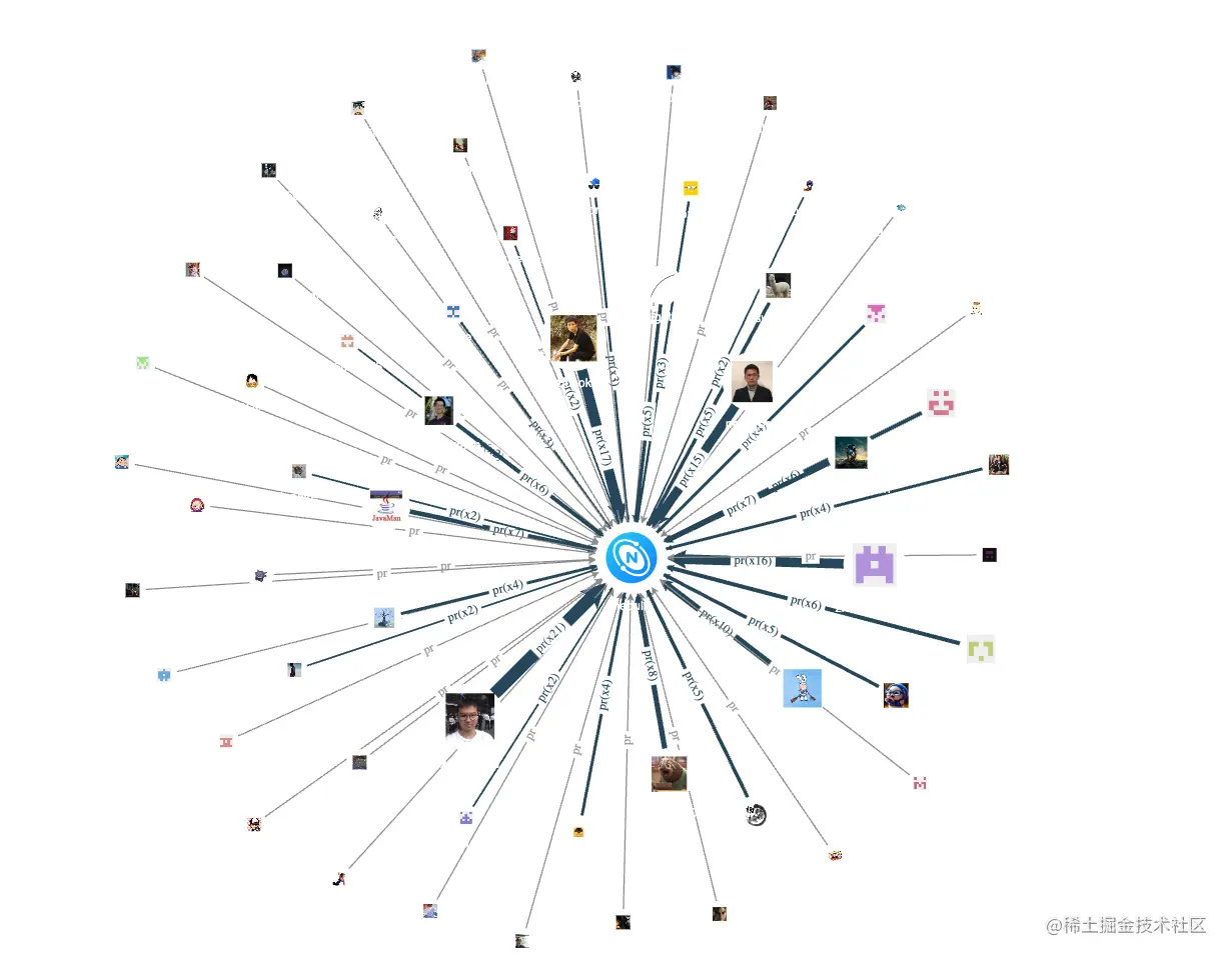 通过合并同类型 pr 边,根据边的粗细我们可以看到核心仓的活跃贡献者。留意上面那个 Java logo 的图像,并非是 nebula 同 Java 联谊了,而是 2020 年的 Committer ChenXU 用了 Java 的 logo 作为头像(狗头)。