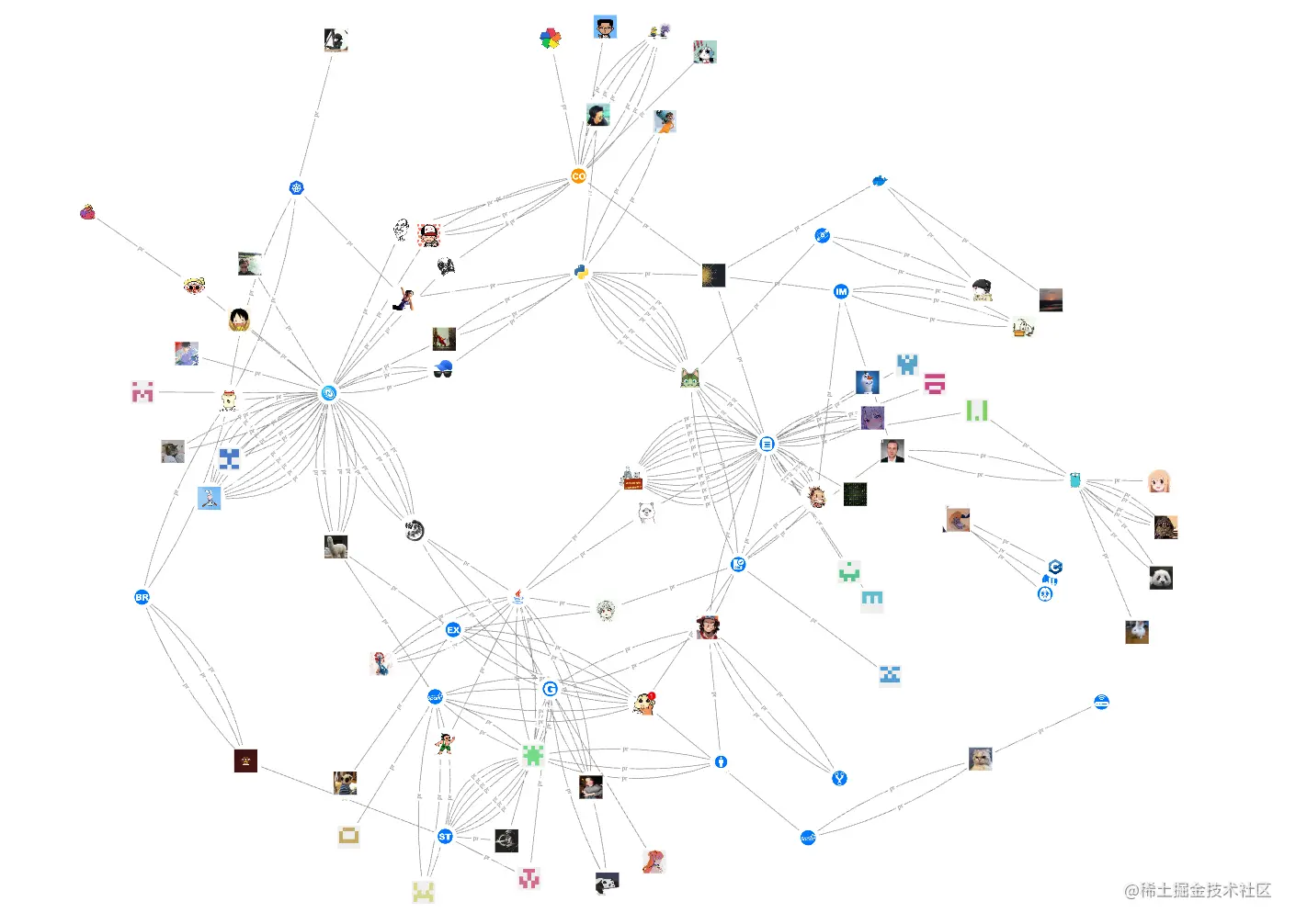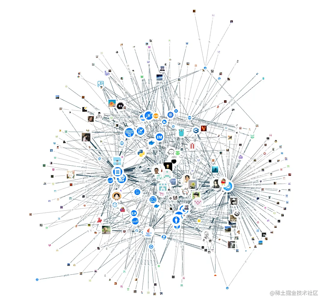 我们把点的头像全部换下,这里为了节省时间找研发小哥龙仔开了个绿色通道批量上传了 contributor 和 repo 点的头像。现在,整图的效果展示是这样的: