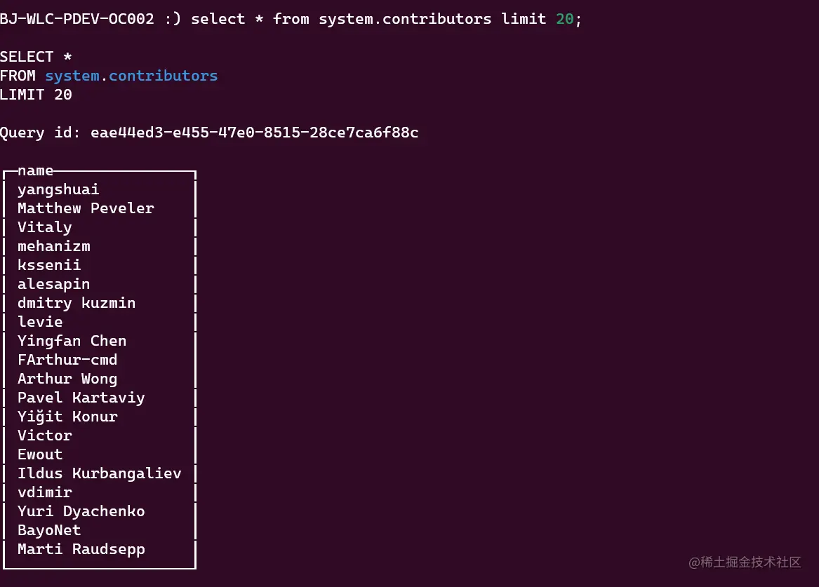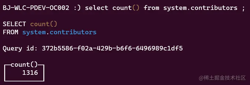 这种用 SQL 方式查看 contributor 的方式还挺 cool 的,毕竟 contributor 是一群通过提交 pr 来完善、迭代产品的人,其中很大一部分的 contributor 是工程师,SQL 更是信手拈来。