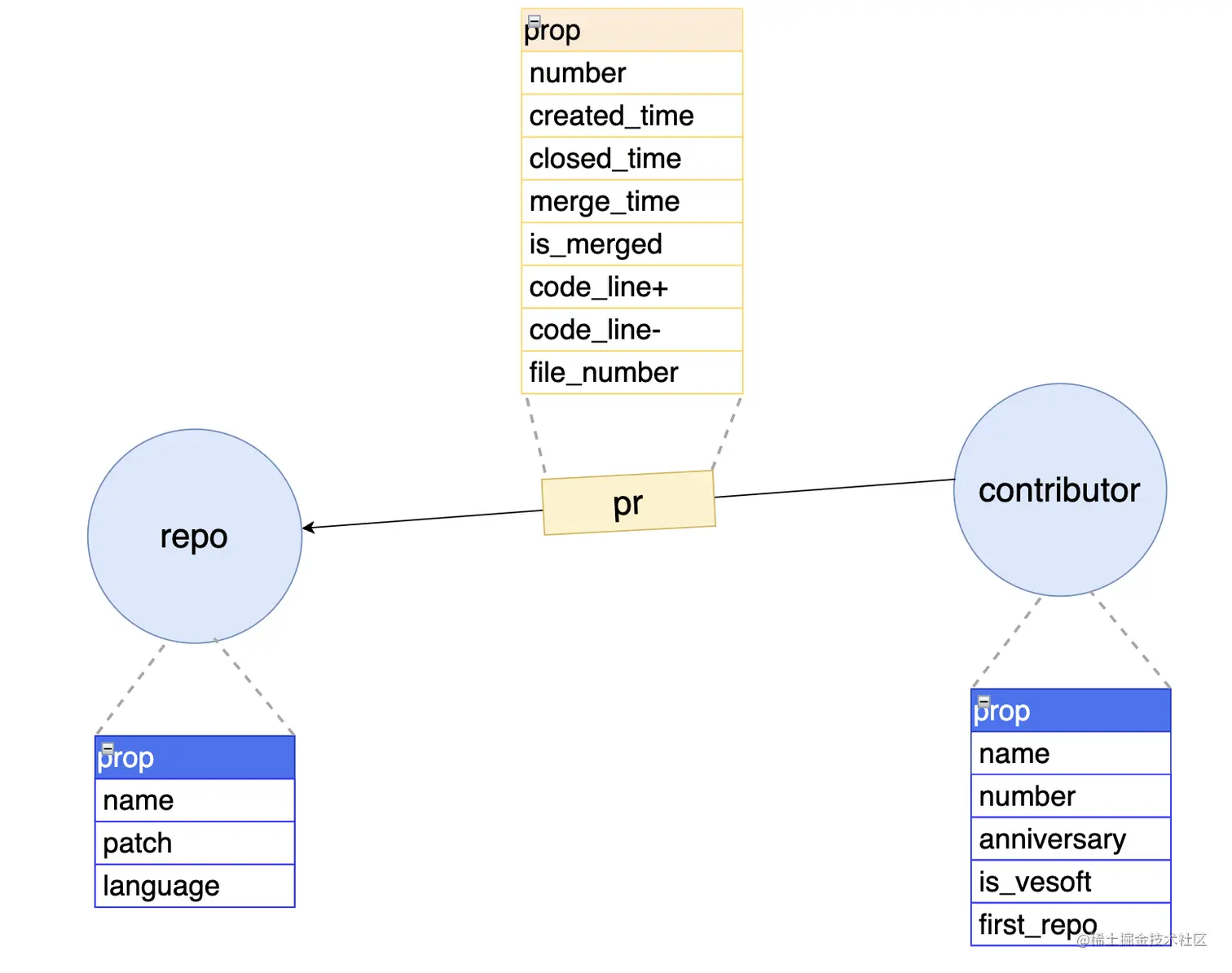 name,贡献者编号number,诞生日anniversary,是否为 NebulaGraph 开发商雇员is_vesoft,第一个被合并 pr 所属仓first_repo。加入了判断“是否为 NebulaGraph 开发商雇员”的属性是为了避免超大节点,因为一个企业雇员的 pr 产量不同于其他的非雇员贡献者。(这点会在后面的可视化展示中体现)