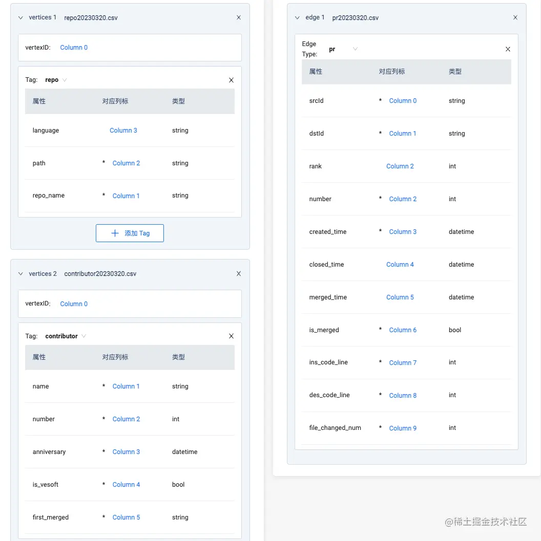 在整个数据集中,我们有两种点:vertices 1 关联 repo 的 csv 数据,vertices 2 关联 contributor 数据,指定各自的 VID 和相关属性的所在列之后,就可以导入数据了。在边数据关联这块,因为我们之前已经在 csv 中加入了 repo 和 contributor 的各自 VID,所以这里同点的关联一样,简单勾选哪列是起点(Column 0)、哪列是终点(对应上图的 Column 1)。