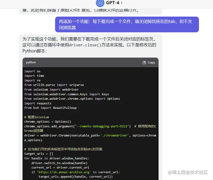 不过下载完成后,还需要手动点击关闭一个个tab。让ChatGPT再添加一个功能:每下载完成一个文件,就关闭掉其所在的tab,但不关闭浏览器