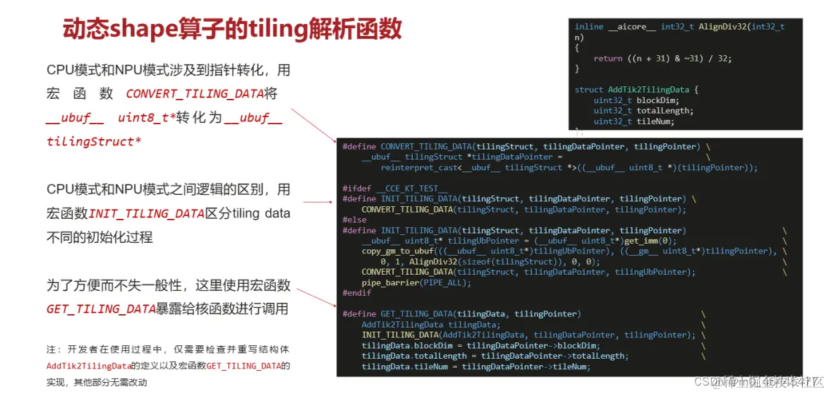 基于现有的固定shape算子,将其改装为动态shape的算子。将控制形状的BLOCK_DIN,TOTAL_LENGTH,TILE_NUN这些变量依靠外界输入得到,在核函数中额外传入一个tiling,它将指向控制核函数逻辑处理的至关重要的这几个变量。