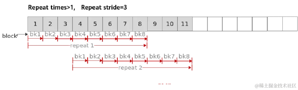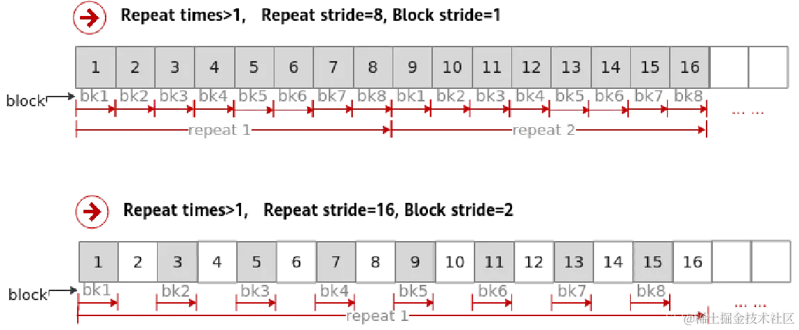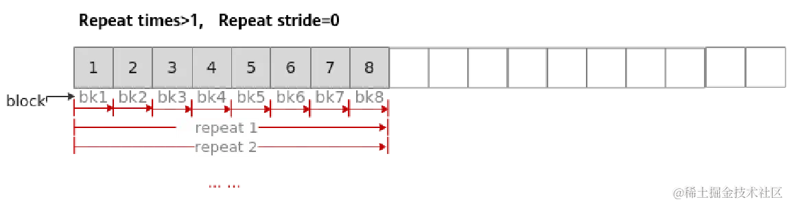 部分重复计算: Repeat stride取值大于0且小于8时,相邻迭代间部分数据会被矢量计算单元重复读取和计算,此种情形一般场景不涉及。