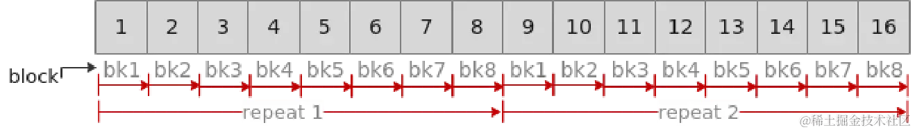 矢量计算单元,一次最多可以计算256Bytes的数据,每次读取连续的8个block(每个block 32Bytes,共256Bytes)数据进行计算,为完成对输入数据的处理,必须通过多次迭代(repeat)才能完成所有数据的读取与计算。 待处理数据大小为16个block(512Bytes),每次迭代处理8个block(256Bytes),需要两次迭代完成计算,Repeat times应设置为2。