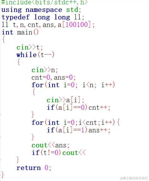 很容易发现,我们只需要遍历整个序列一共有多少个0,假设是n个0,那么再遍历前n个数,遇到1则ans加1,相当于用前n个里的1去消除掉后面的0。