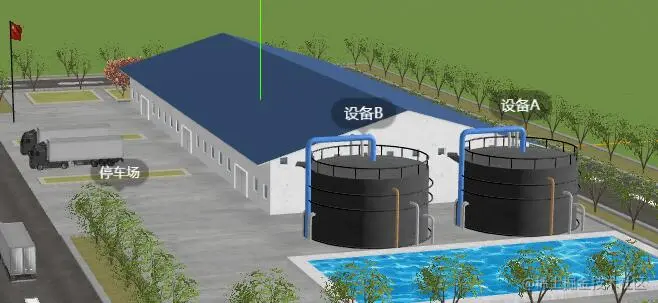 工厂模型中分别命名了三个空对象设备A标注、设备B标注、停车场标注。