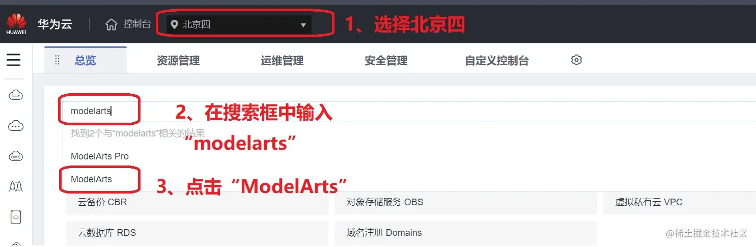 1、登录华为云,选择“控制台”,通过搜索方式,进入ModelArts