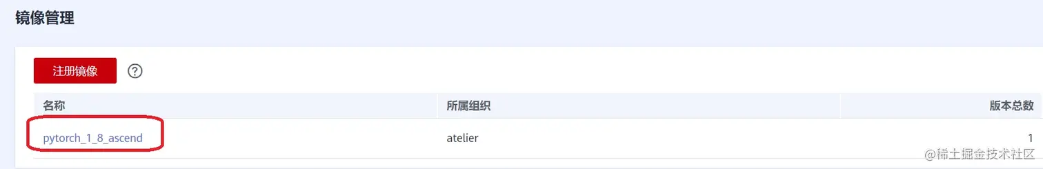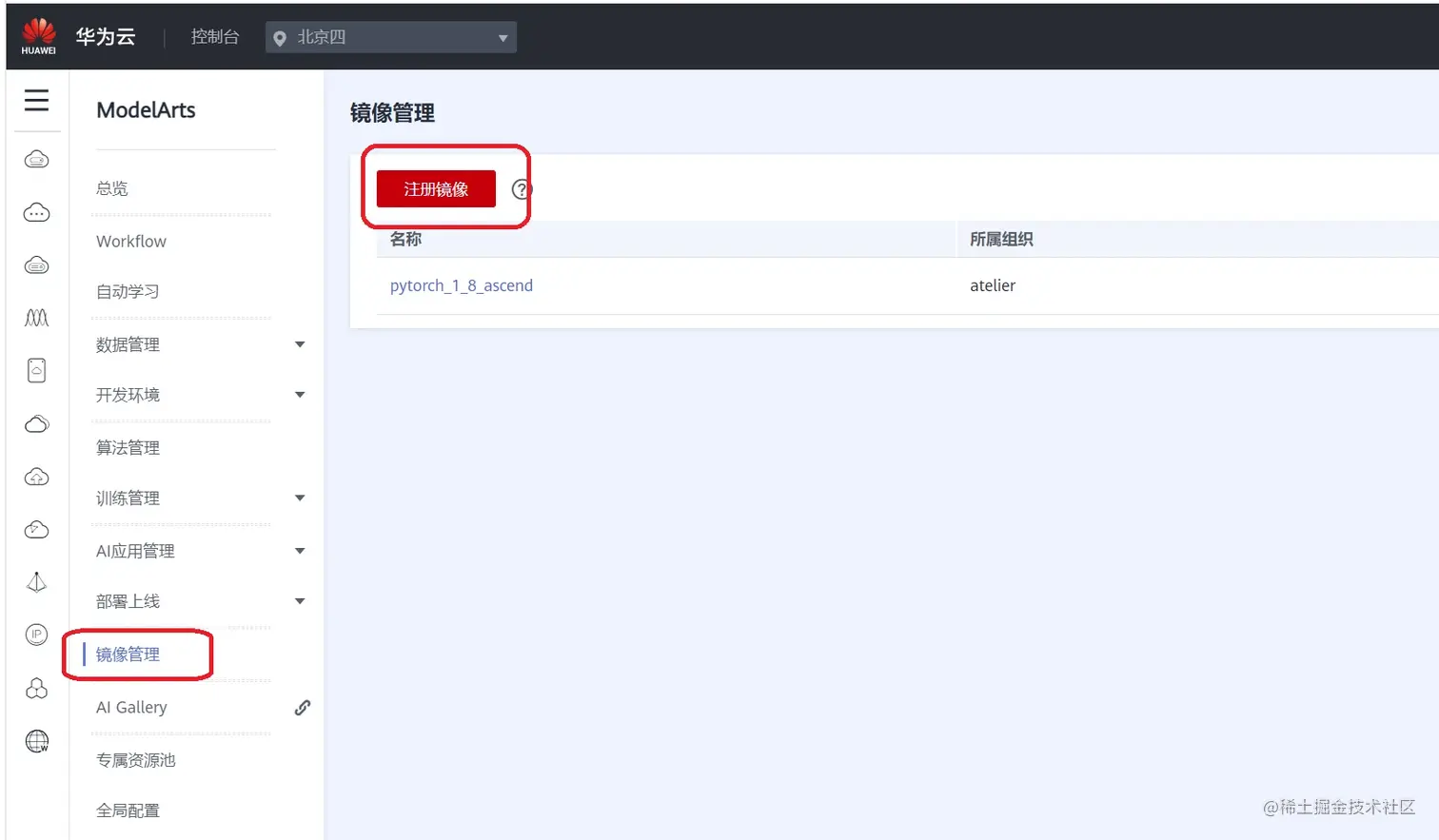 此时会弹出新的tab页——ModelArts,选择“镜像管理”,点击“注册镜像”