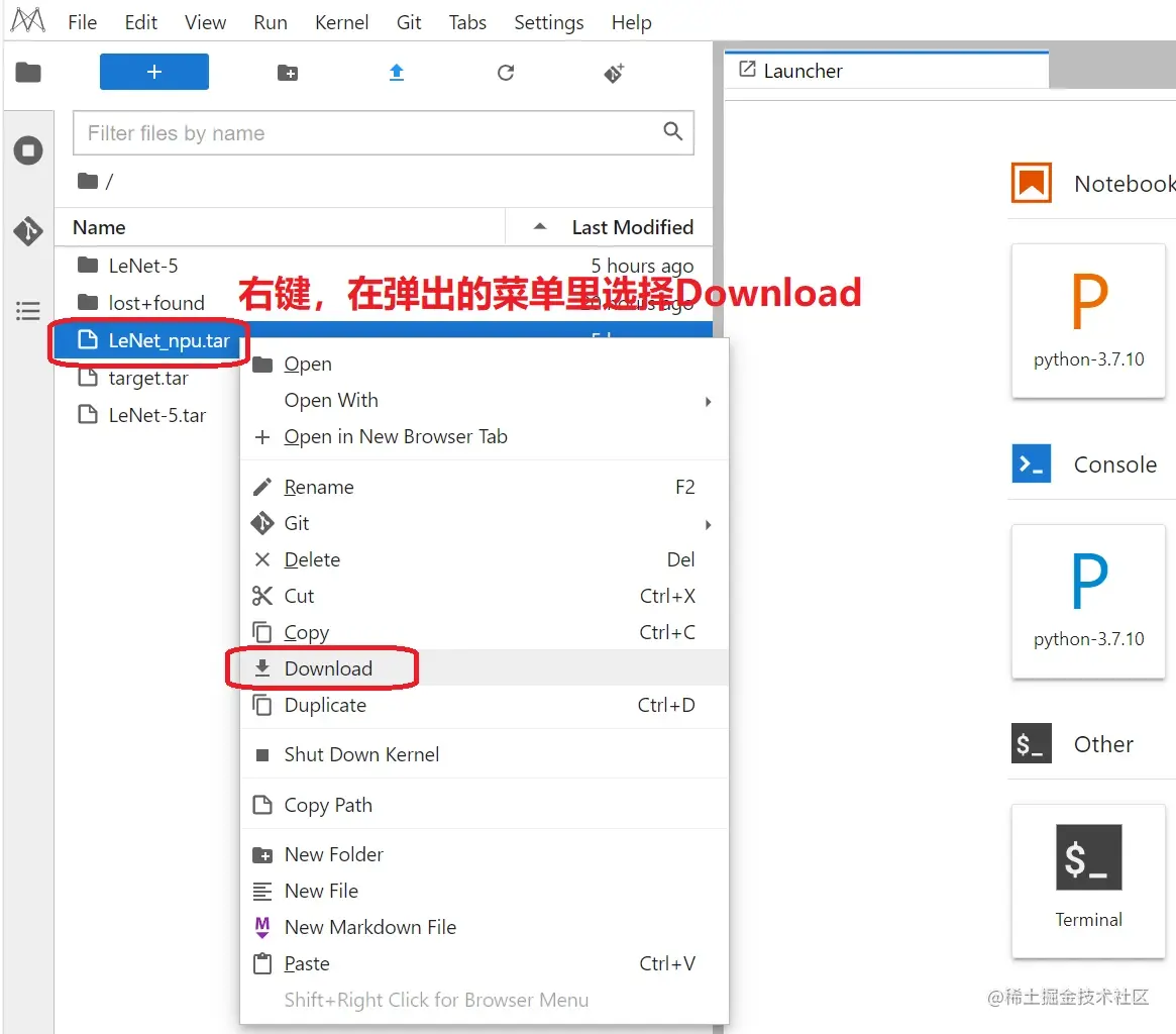 将运行结果下载下来,后续再做分析。由于modelarts的notebook对下载文件大小的限制,先将各目录下的训练数据目录“mnist_data”删除,然后在LeNet-5目录同级下,执行“tar -cvf LeNet_npu.tar ./LeNet-5”,生成压缩包LeNet_npu.tar。