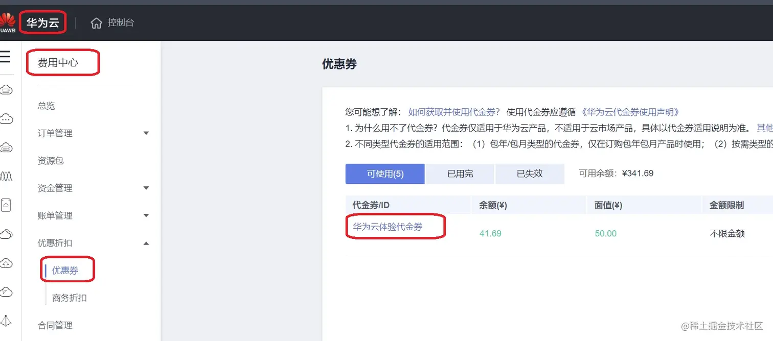 申请成功后,可以在“华为云”/“费用中心”/“优惠券”里有代金券,面额是50元。