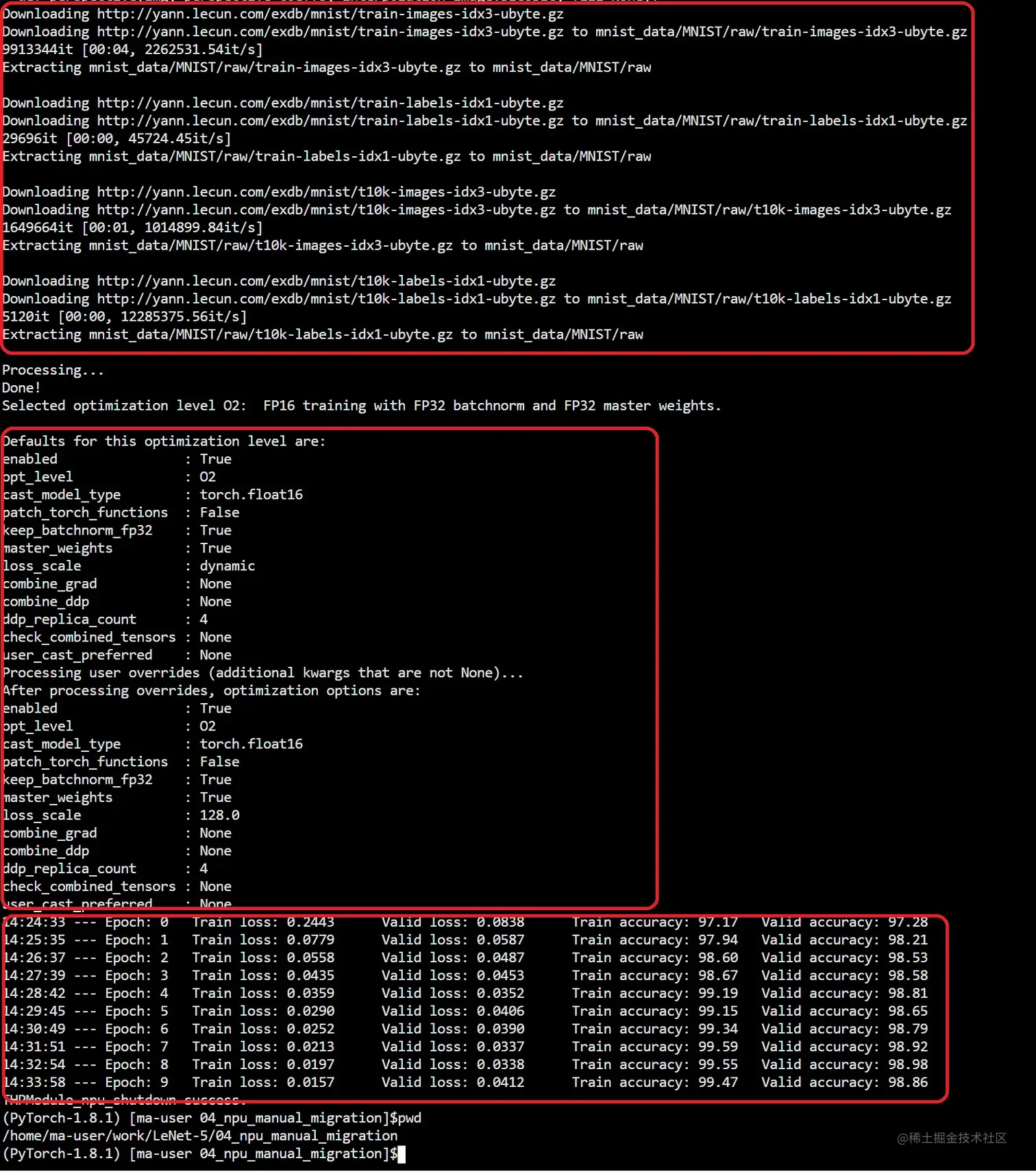 打开终端,进入LeNet-5/02_npu_auto_migration,运行训练脚本。