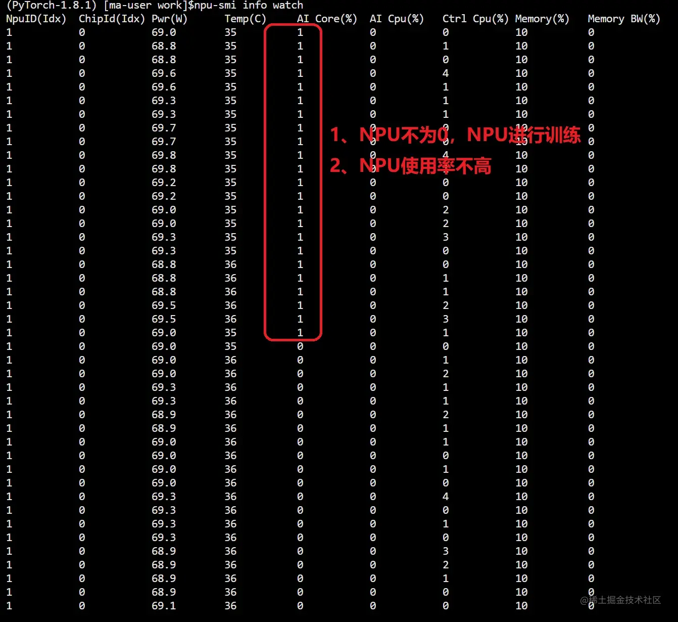 二)、发现在训练的过程中NPU的使用率不高,下一步要研究代码,掌握调优的方法,提高训练效率。