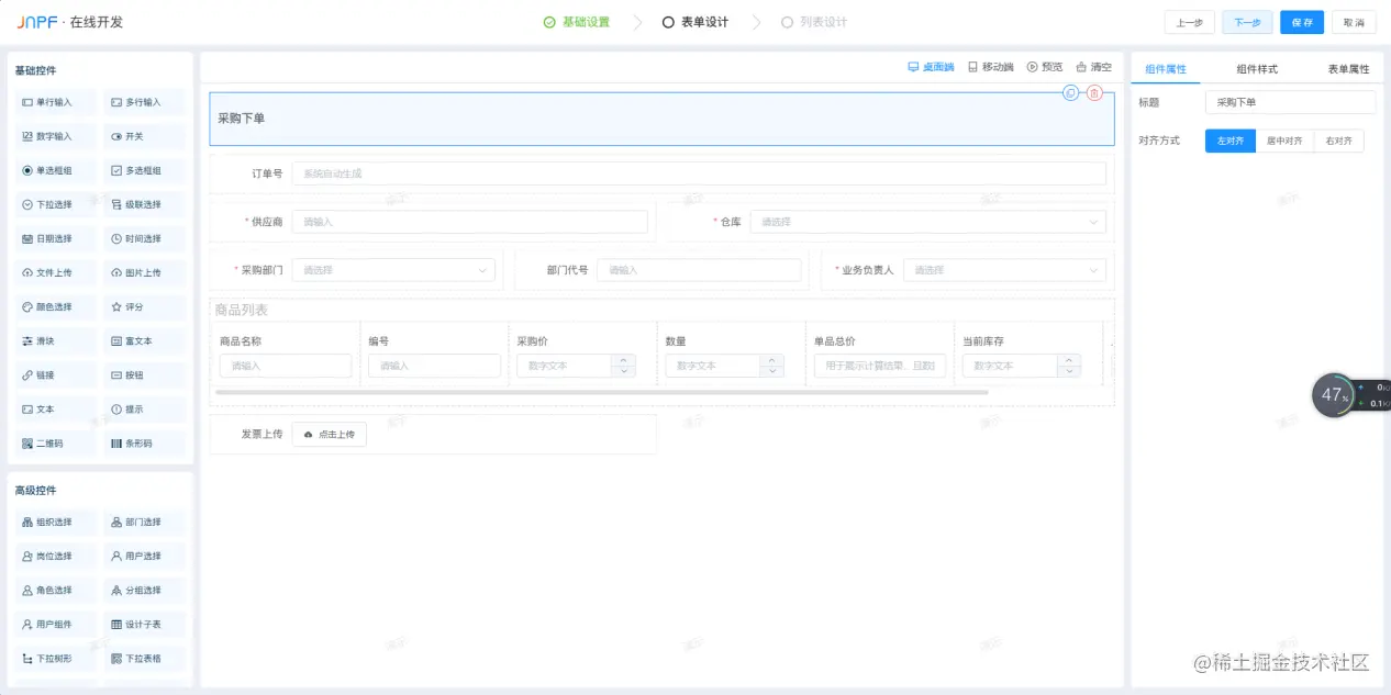 左侧是拖拽组件,中间是花边,有侧是编辑属性。通过左侧拖拽表单将事件排列在上面,进行简单的数据收集。右边是对表单进行数据处理,比如标题、宽度、对齐方式等设置。适合业务人员去操作填写数据表格,快速生成自己想要的数据收集,这是表单驱动的一种方式。