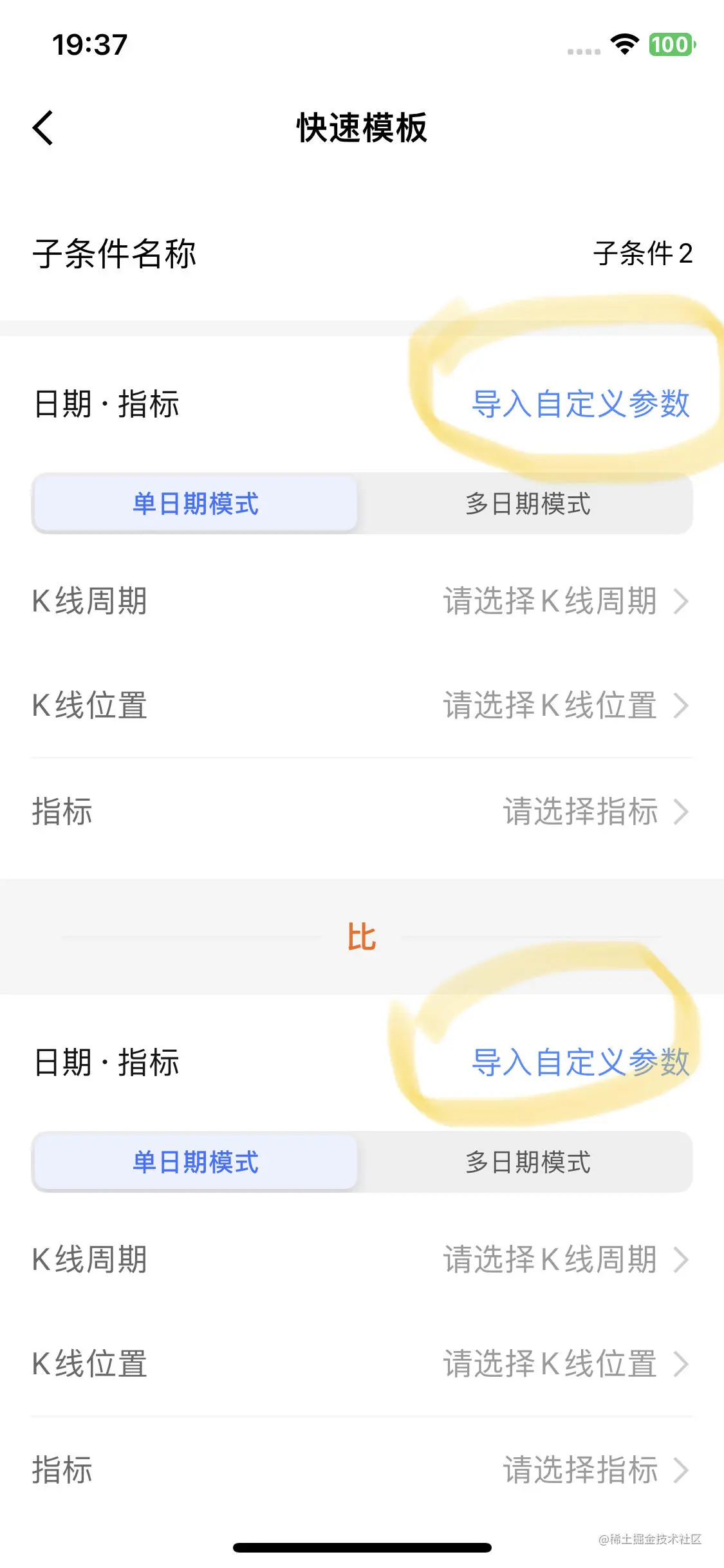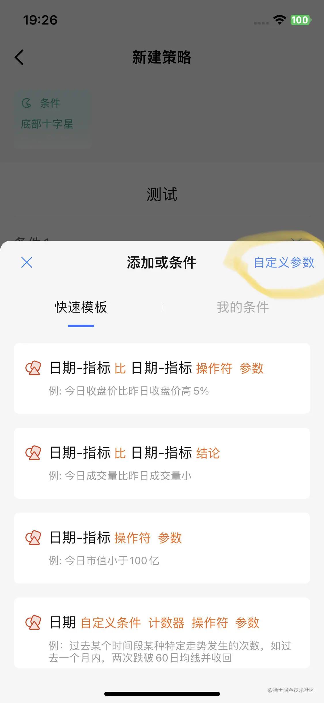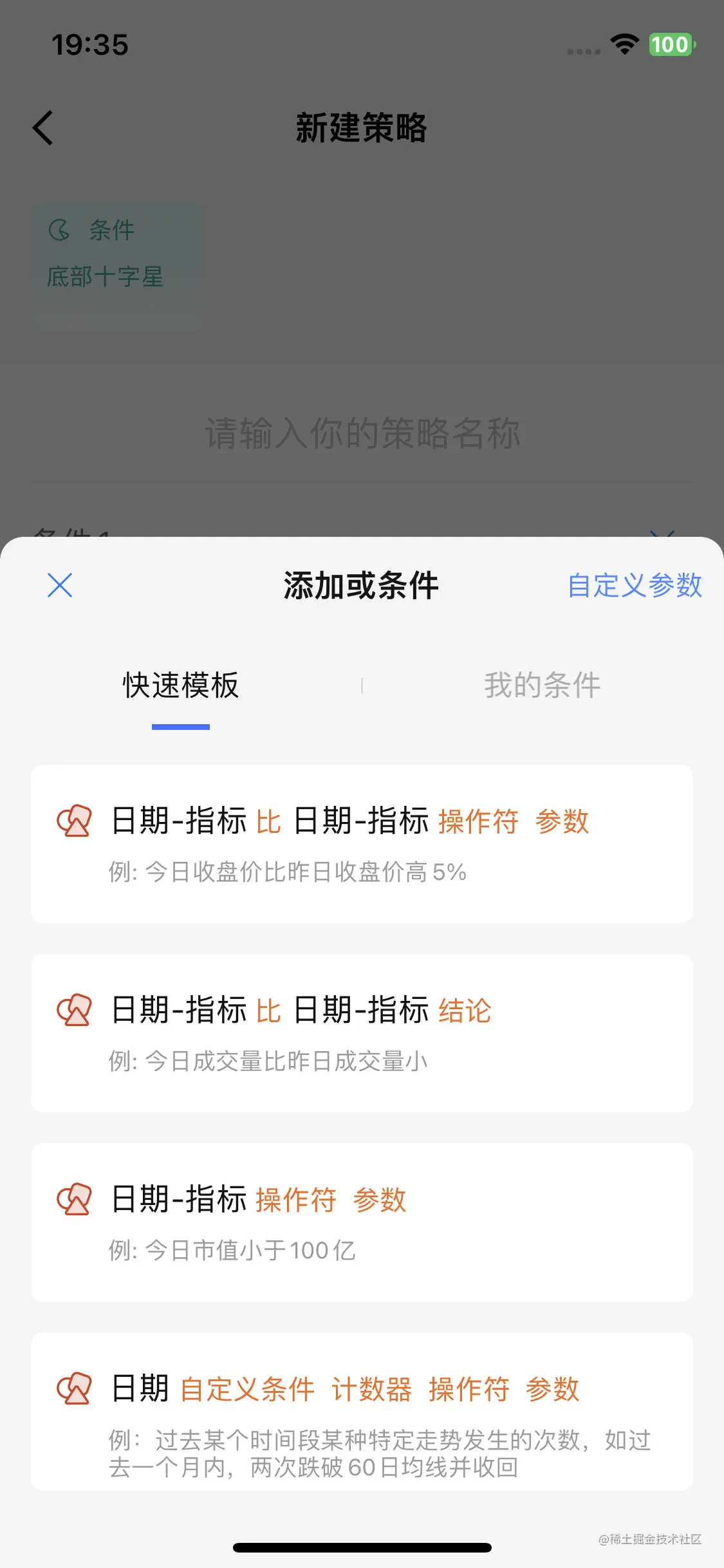我们在应用内内置了例如收盘价,均线价格,成交量等指标。如果这些指标都不能直接满足你的需求,或者需要在次基础上进行加工,那么你可以通过这些内置指标进行算术运算,得到自己的自定义参数。在模板选择的弹窗右上角,我们可以看到这个按钮