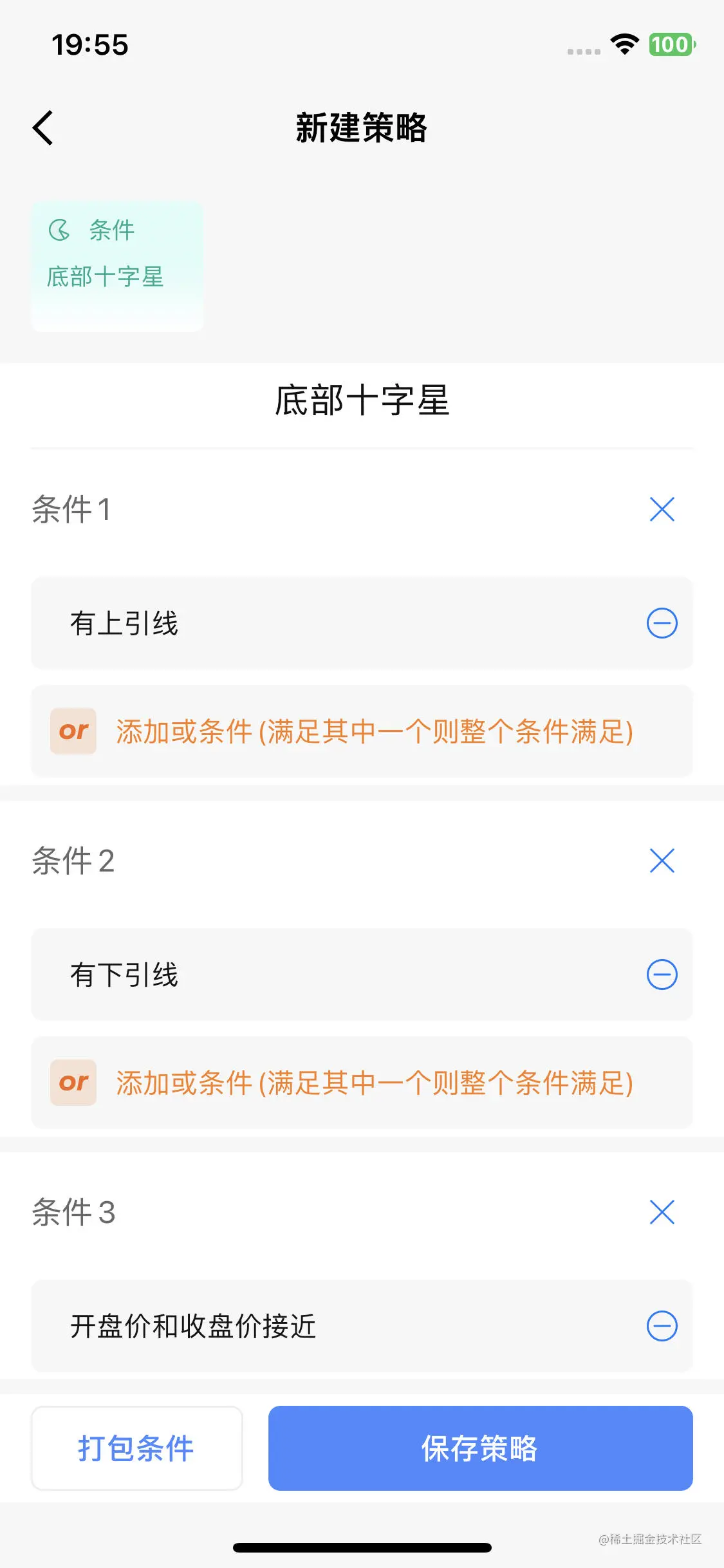 我们在创建策略的页面中,设置好一系列条件后,可以点击“保存策略”按钮将其保存为一个可用的选股策略。也可以点击左边的“打包条件”按钮将其打包为一个自定义条件。如上所示,我们将一个底部十字星策略打包为一个自定义条件后,就可以在“我的条件”中看到这个自定义条件,我们可以将这个自定义条件选为一个策略的子条件。也可以在模板4中使用这个自定义条件。例如,我们认为底部集中出现十字星是强烈反转信号,我们可以在模板4中设置最近5天底部十字星出现了2次以上来作为一个选股条件。