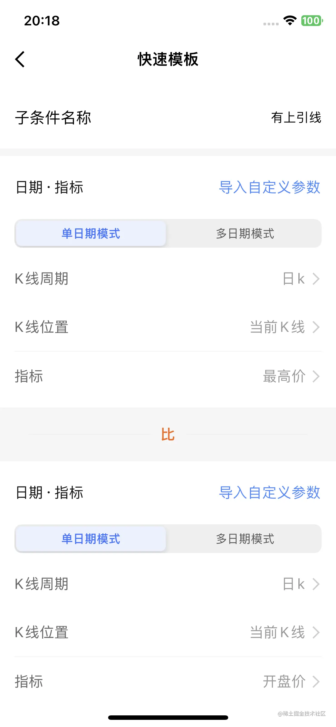 进入到模板1后,我们开始填充模板内容。因为我们的十字星策略是基于日K来选股,所以我们在K线周期一栏选择日K。选择完K线周期后,我们需要选择K线位置,K线位置中的“当前K线”代表的是策略执行的那一刻所对应的那根K线(在回测功能中我们可以手动设置到过去某一天用历史数据执行这个策略。而盘中实时运行则代表当天这根K线)。我们想在出现形态当天选出这个股票,所以这里我们选择“当前K线”作为我们的K线位置。两个指标分别选择最高价和开盘价