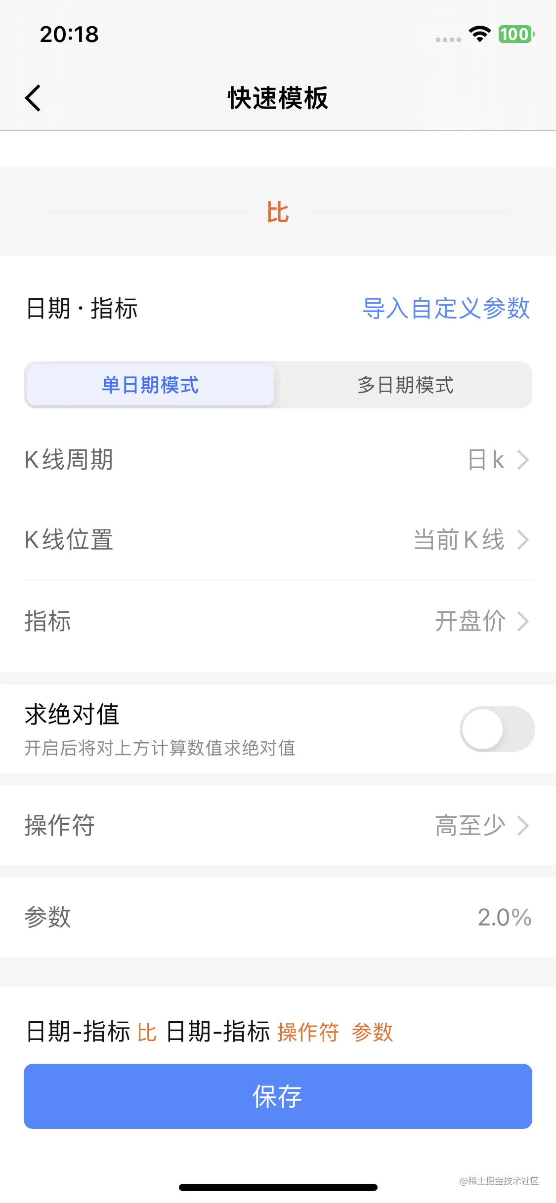 两个指标填充完后,我们还需要选择操作符和输入参数。操作符我们选择了“高至少”。参数我们输入2%。点击保存按钮。至此,我们就将上引线条件设置好了。