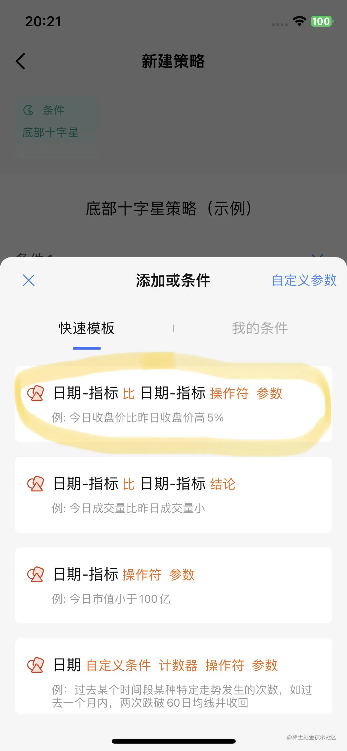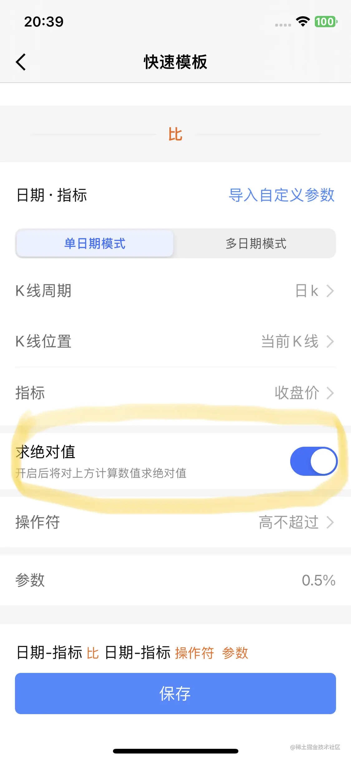 同样,我们通过模板1来创建条件3,指标设置与前两个条件思路相同,但在这里我们使用到了“绝对值”功能。因为开盘价可能比收盘价高,也可能低。只要两者差值够小,我们就认为满足条件。所以我们选择打开“绝对值”功能。这样无论两个指标谁大,在绝对值后效果相同。随后在参数面板输入0.5%。那么条件3我们就创建好了。