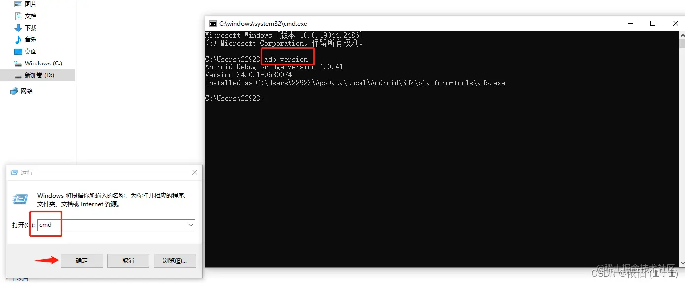 2.4 adb命令测试,win+R,输入cmd,命令行窗口输入adb verison,显示版本等信息表示配置成功。