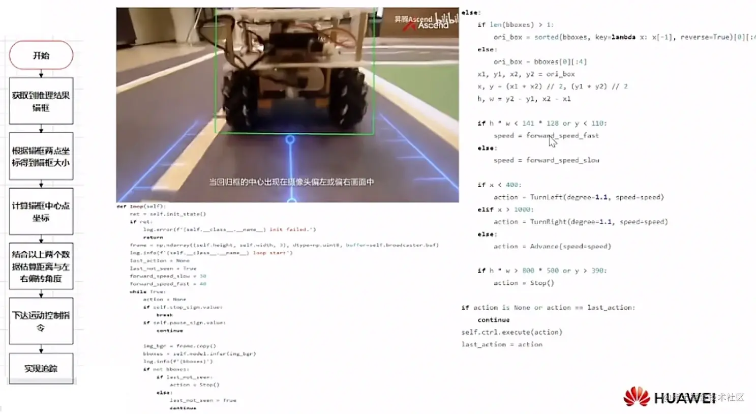 2、使用模型适配工具训练转换的om模型进行推理,根据识别到物体的大小来推算小车和追踪目标之间的距离,下发指令到控制系统,控制小车的移动和停止,从而达到跟随效果(开发者也可以移植改功能到追踪其他物体的使用场景中)。