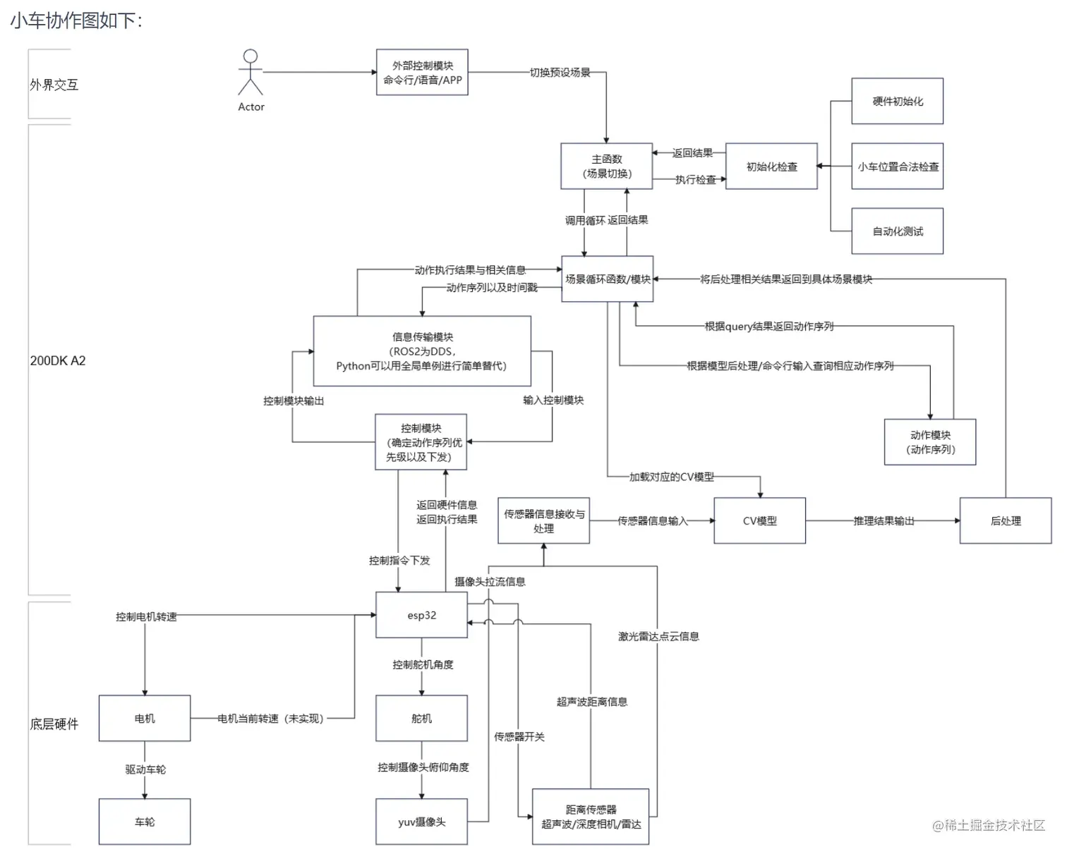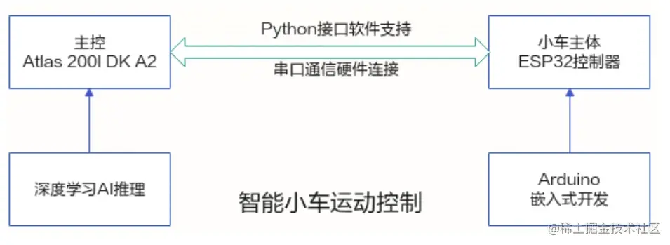 智能小车通过摄像头感知周围环境自主地进行运动控制,采集环境数据后在开发者套件上进行AI推理,根据推理结果发出指令控制小车的运动状态。小车运动状态的控制需要借助ESP32微控制器,使用Arduino平台可以对其进行嵌入式开发。主控与小车主体间控制指令的发出和数据的返回,过串口协议进行双向通信。协作框图如下: