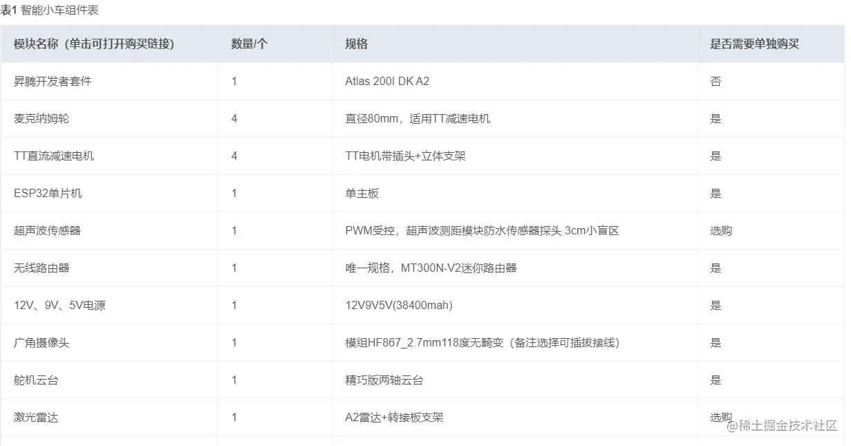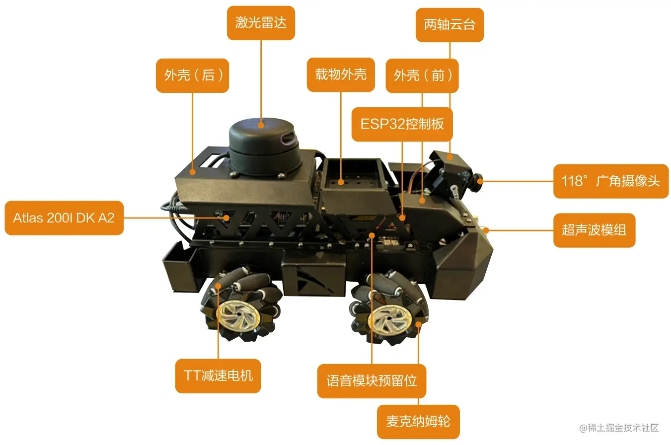 需要依照从下至上的顺序组装小车,组装底盘上的连接件,按照“电池 > TT直流电机 > 麦克纳姆轮 > 广角摄像头模块 >ESP32单片机 > 第一层外壳 > 超声波模块 > 语音麦克风阵列 > Atlas 200I DK A2开发者套件 > 激光雷达连接到后段外壳 > 前中段外壳顺”序组装。详细步骤见官方文档:www.hiascend.com/document/de…