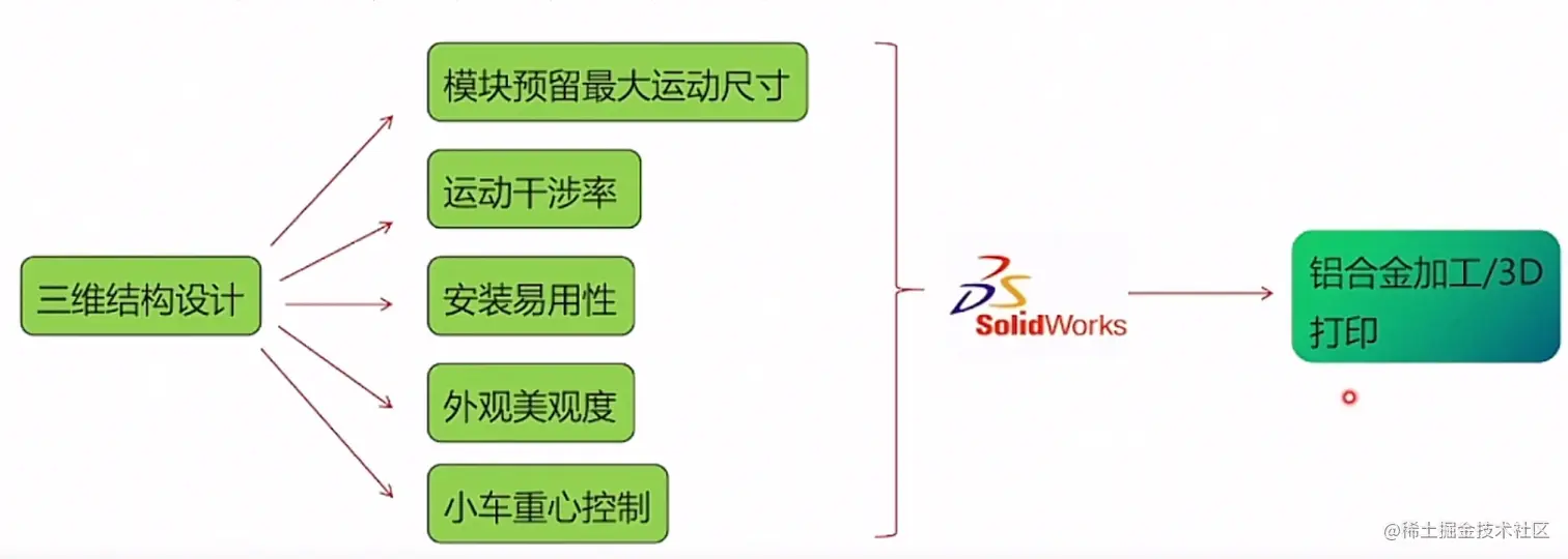 从零开始设计并搭建智能小车,在满足外观要求的基础上,要满足小车运转过程中的运动干涉率为0,并且需要考虑实际安装时的易用性与可行性,以及智能小车的重心位置的控制等。