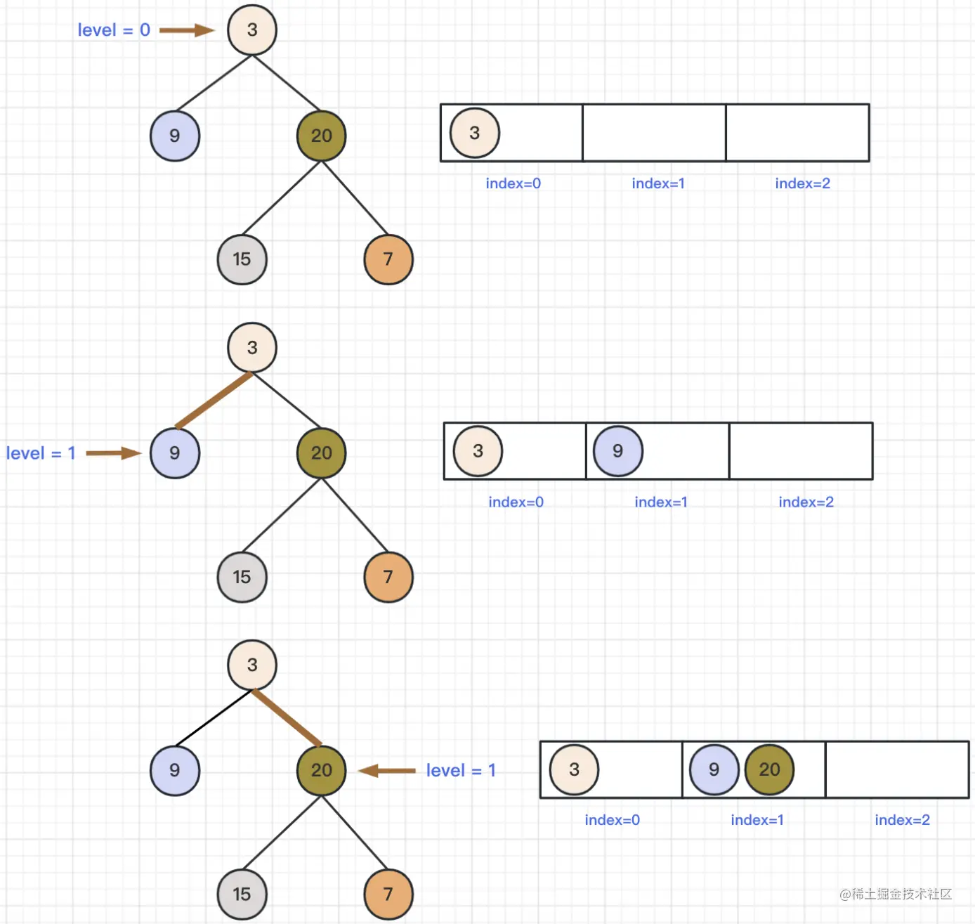 以上就是深度优先遍历的解题思路,为了便于理解,下面我们以输入root = [3,9,20,null,null,15,7]为例,看一下具体的处理过程。