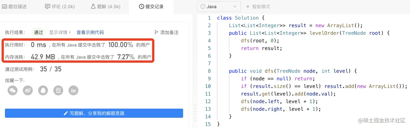 除了广度优先,我们也可以采用深度优先算法来进行解题,这里面我们可以通过借助递归的方式,将level层级作为方法入参,然后利用list.get(level)的方式获得这个层级的节点值集合。操作步骤如下所示: