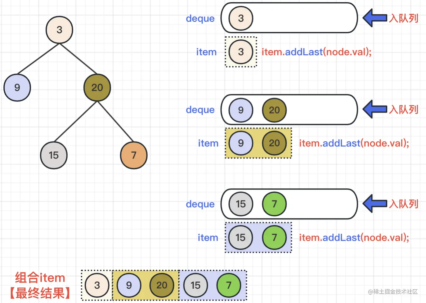 其中,关键的点就是通过deque来暂存节点,以及每次从deque中获取num个节点元素。因为deque中有可能存入的是两个层中的Node节点,那么就无法区分哪些是一层的了。为了便于理解,下面我们以输入root = [3,9,20,null,null,15,7]为例,看一下具体的处理过程。