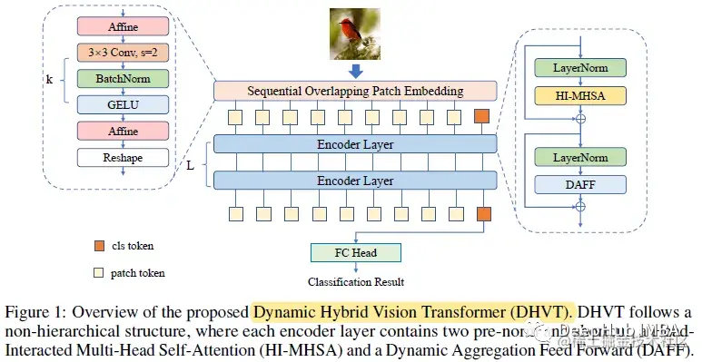 然后将特征映射重塑为补丁并与cls令牌连接,并发到编码器层。每个编码器包含层归一化、多头自注意力和前馈网络。将MHSA网络改进为头部交互多头自注意网络(HI-MHSA),将前馈网络改进为动态聚合前馈网络(DAFF)。在最后的编码器层之后,输出类标记将被馈送到线性头部进行最终预测。