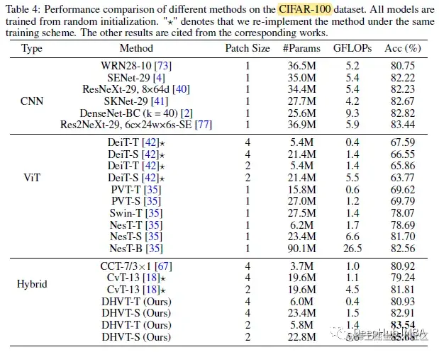 DHVT-T: 12层编码器,嵌入维度为192,MLP比为4,CIFAR-100和DomainNet上的注意头为4,ImageNet-1K上的注意头为3。DHVT-S: 12层编码器,嵌入维度为384,MLP比4,CIFAR-100上注意头为8,DomainNet和ImageNet-1K上注意头为6。