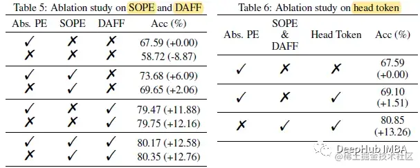 DeiT-T 4头,从头开始训练300次,基线成绩67.59。当移除绝对位置嵌入时,性能急剧下降至58.72。当采用SOPE并取消绝对位置嵌入时,性能下降幅度并不大。