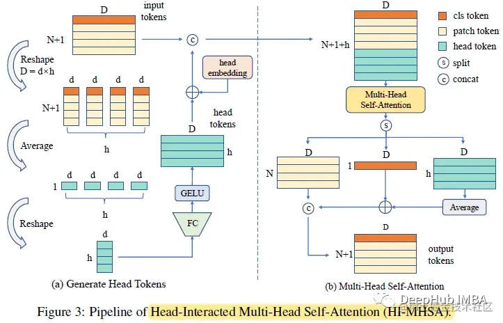 在HI-MHSA中,每个d维令牌,包括类令牌,将被重塑为h部分。每个部分包含d个通道,其中d =d×h。所有分离的标记在它们各自的部分中取平均值。因此总共得到h个令牌,每个令牌都是d维的。所有这样的中间令牌将再次投影到d维,总共产生h个头部令牌。最后,将它们与补丁令牌和类令牌连接起来。