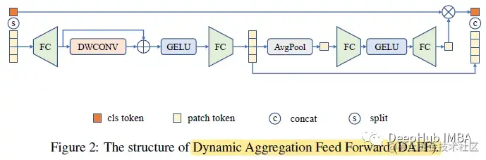 ViT 中的普通前馈网络 (FFN) 由两个全连接层和 GELU 组成。DAFF 在 FFN 中集成了来自 MobileNetV1 的深度卷积 (DWCONV)。由于深度卷积带来的归纳偏差,模型被迫捕获相邻特征,解决了空间视图上的问题。它极大地减少了在小型数据集上从头开始训练时的性能差距,并且比标准 CNN 收敛得更快。还使用了与来自 SENet 的 SE 模块类似的机制。