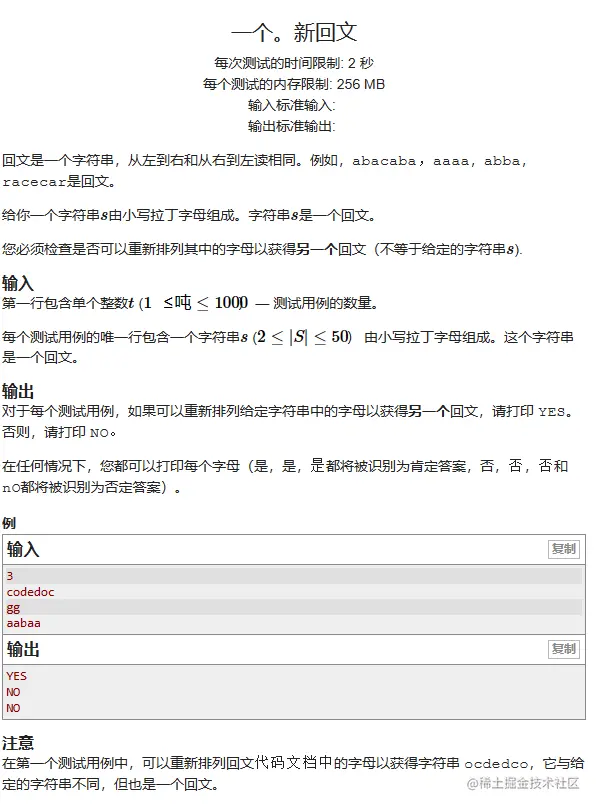题目就是问给出的字符串能否通过重新排序变成回文字符串(且不能和本身一样)