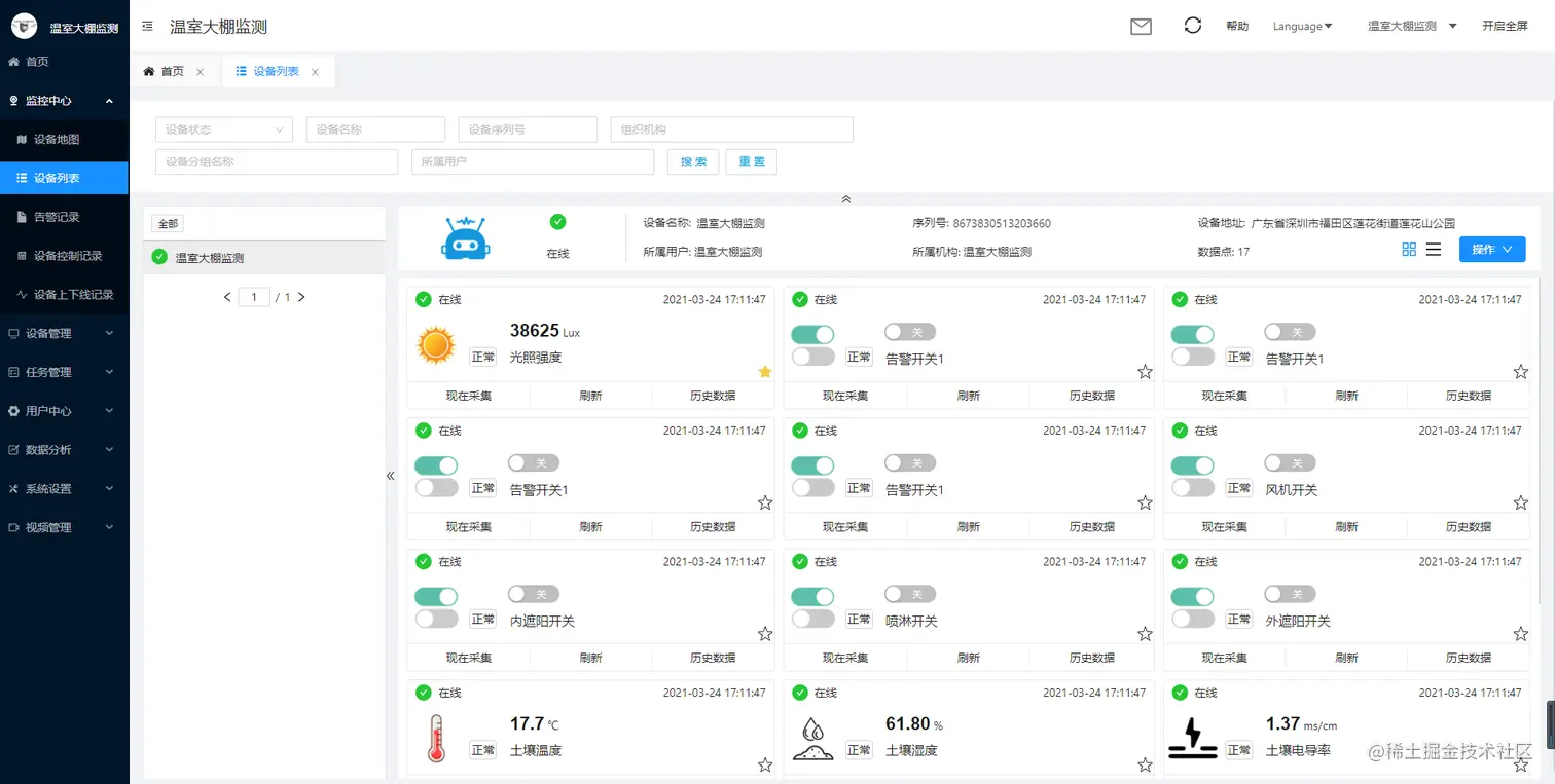 采用金鸽科技的物联设备,只需要接入对应监测指数的传感器,将设备放置在每一个温室大棚,便可完美地监控这些指数。我们还提供温室大棚监测云平台的接入,提供数据采集、数据存储、设备地图、历史数据分析曲线、定时任务、报警功能(短信、微信、邮件、APP)、权限管理(金字塔结构,完善的机构、角色、用户体系)、三端互通(WEB网页、APP、微信公众号)。