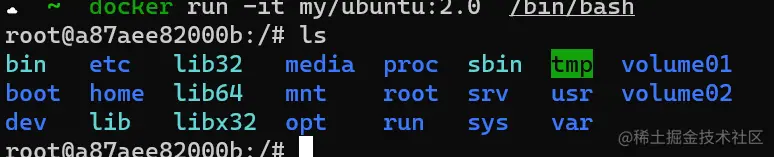 进入我们生成的镜像可以看到volume01和volume02,是我们挂载的卷