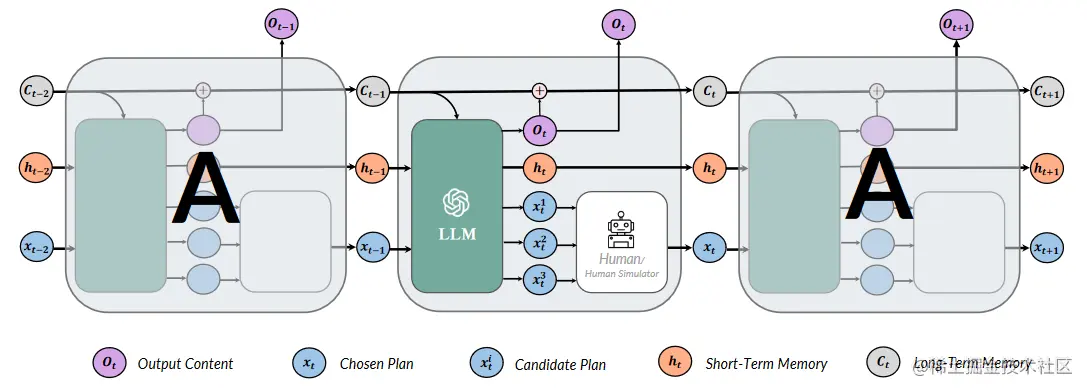 RecurrentGPT 的整体架构基于模型与其自身进行的交互(可参考文献 Interactive Natural Language Processing )。