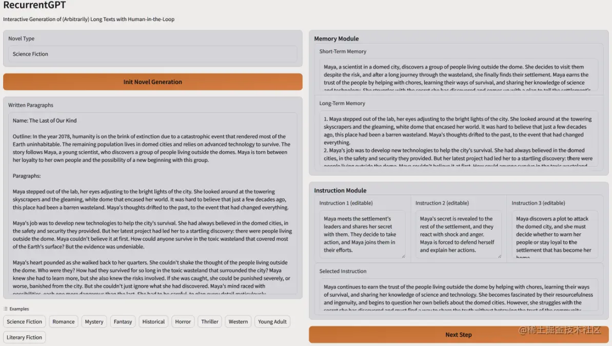 用法三:类似于互动视频那样,RecurrentGPT 不仅可以服务于内容创作者,还能直接给内容消费者提供新的体验,作者称之为 "AI as Content"("AI即内容")。内容消费者不仅可以读小说,还能与小说直接进行互动,跳过内容创作者使用AI进行内容创作的步骤。